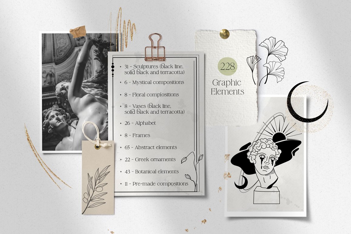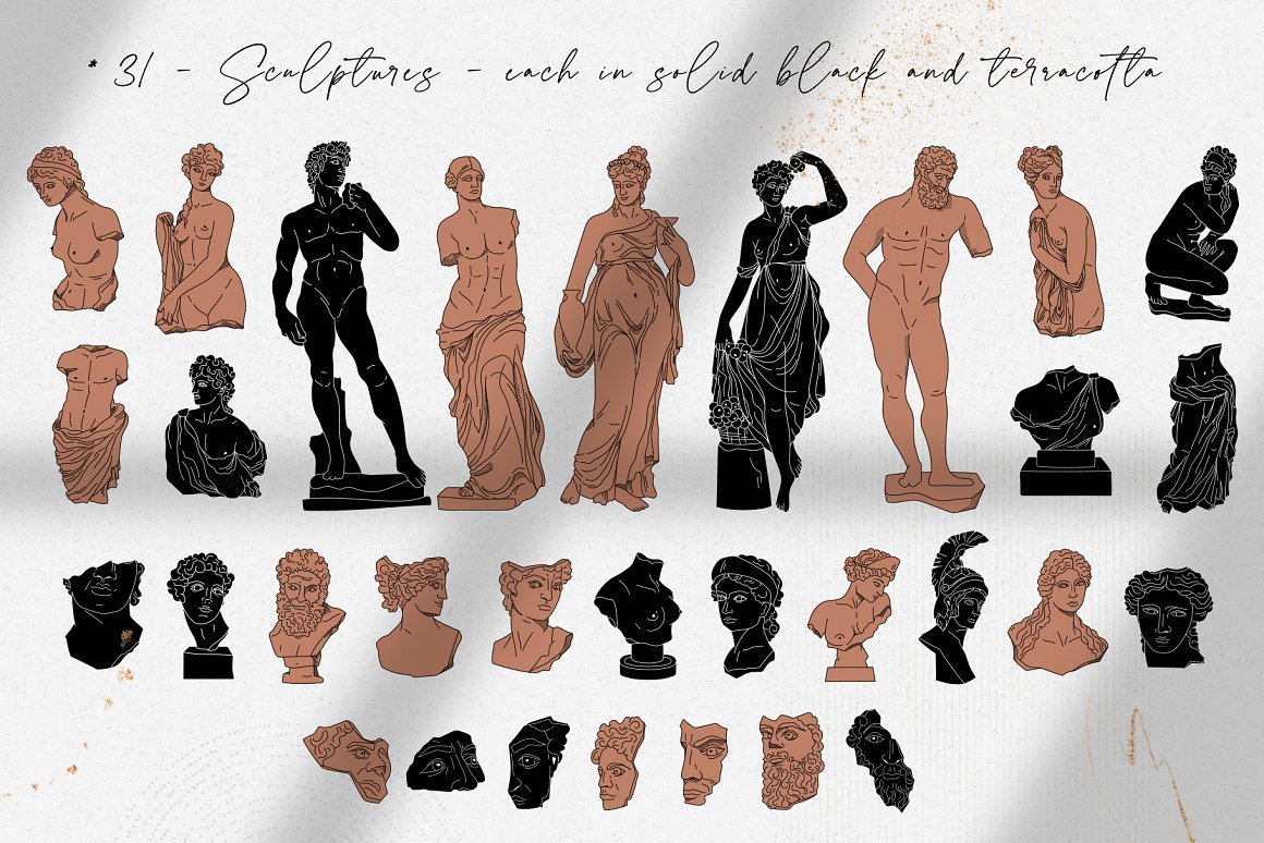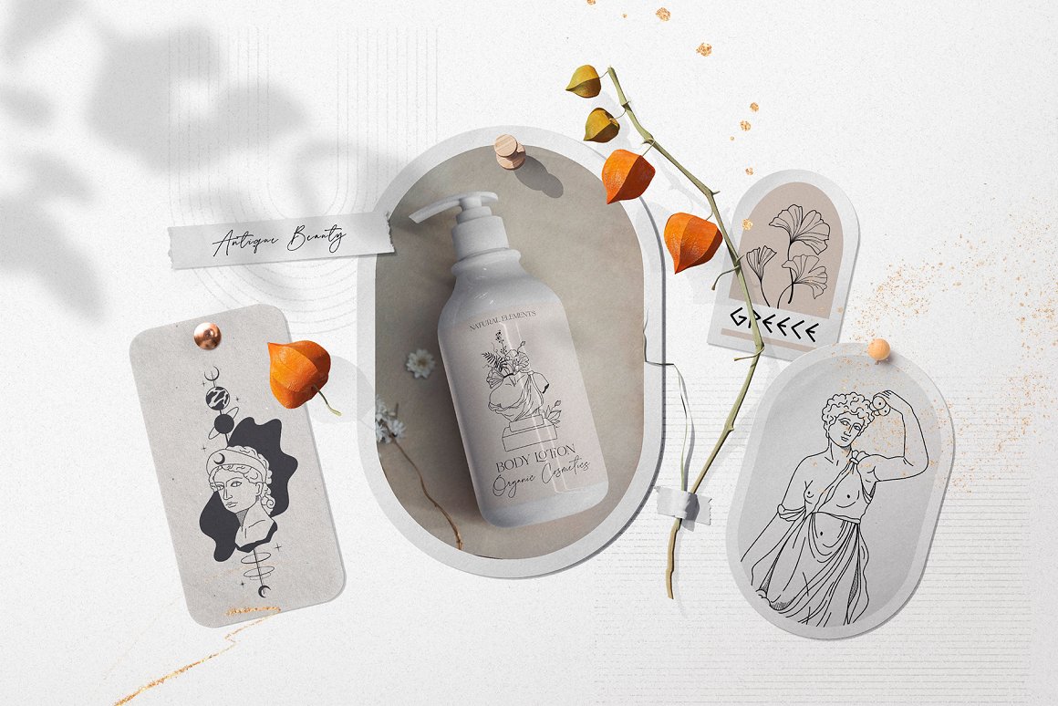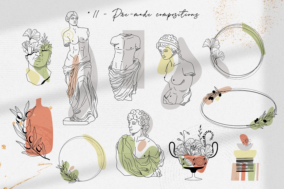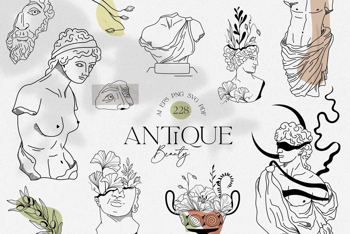 新推出的Antique Greek Beauty 设计套件,这是一套精美的手绘矢量图案素材。该素材包含了228个高清晰度的图案,包括矢量格式(SVG、EPS-10、AI)和位图格式(PNG),提供三种颜色方案:黑线条、纯黑色以及赤陶色。此外,为了增加艺术气息,还加入了一些抽象的自然色彩元素。