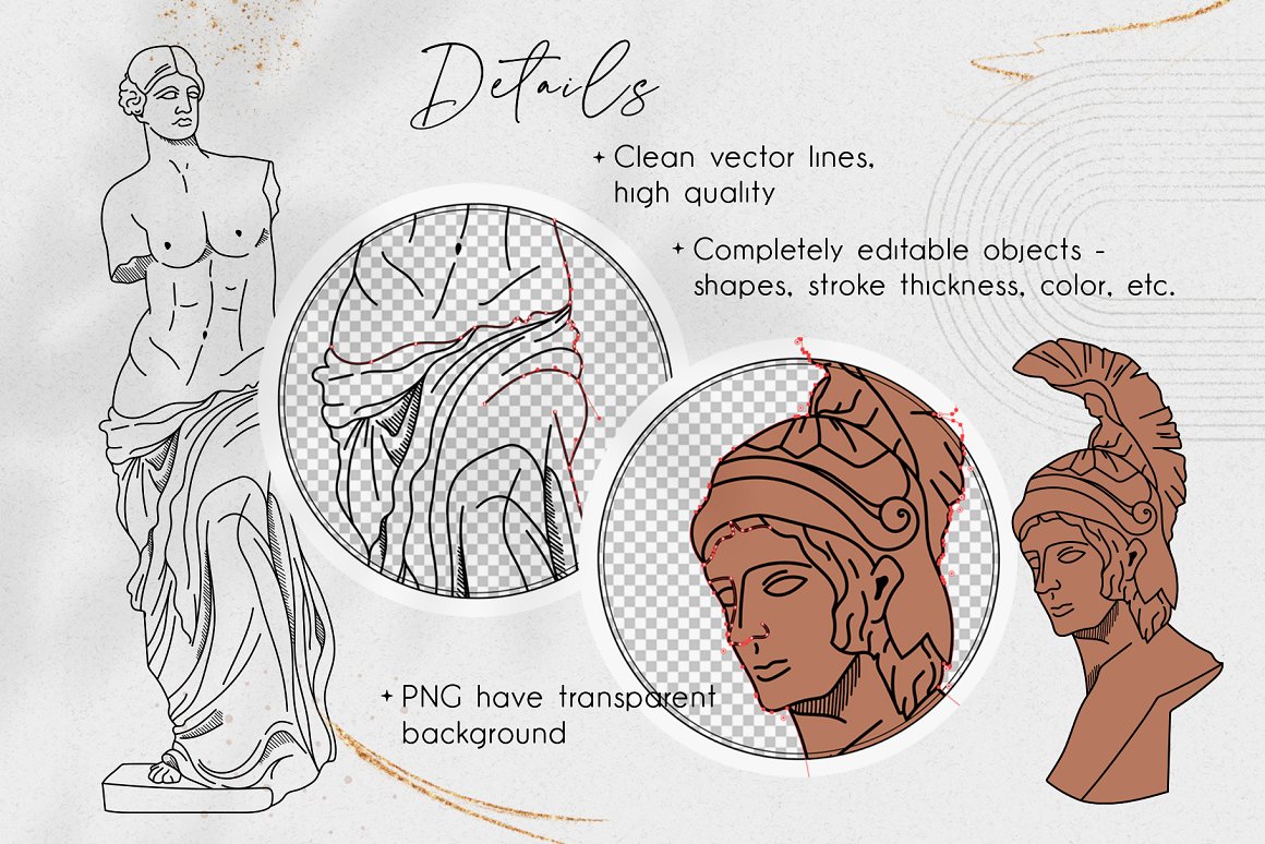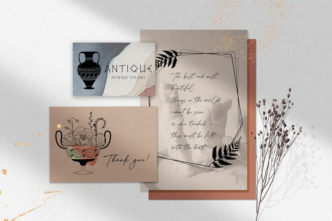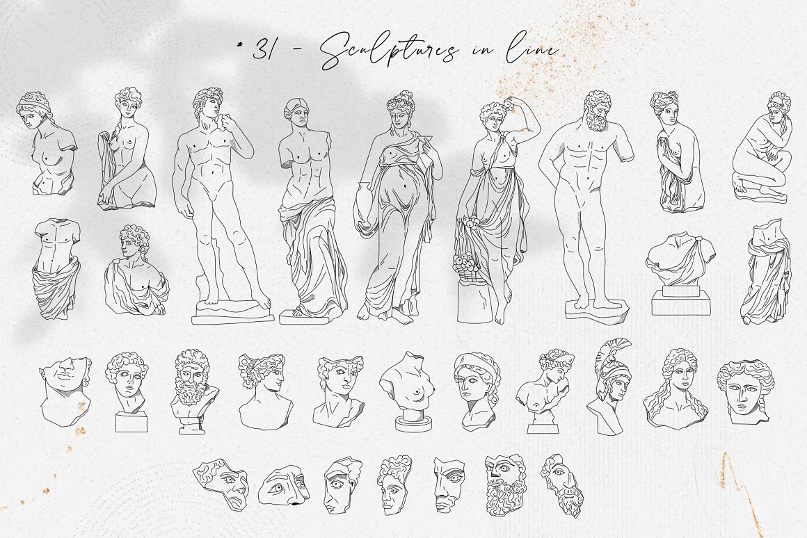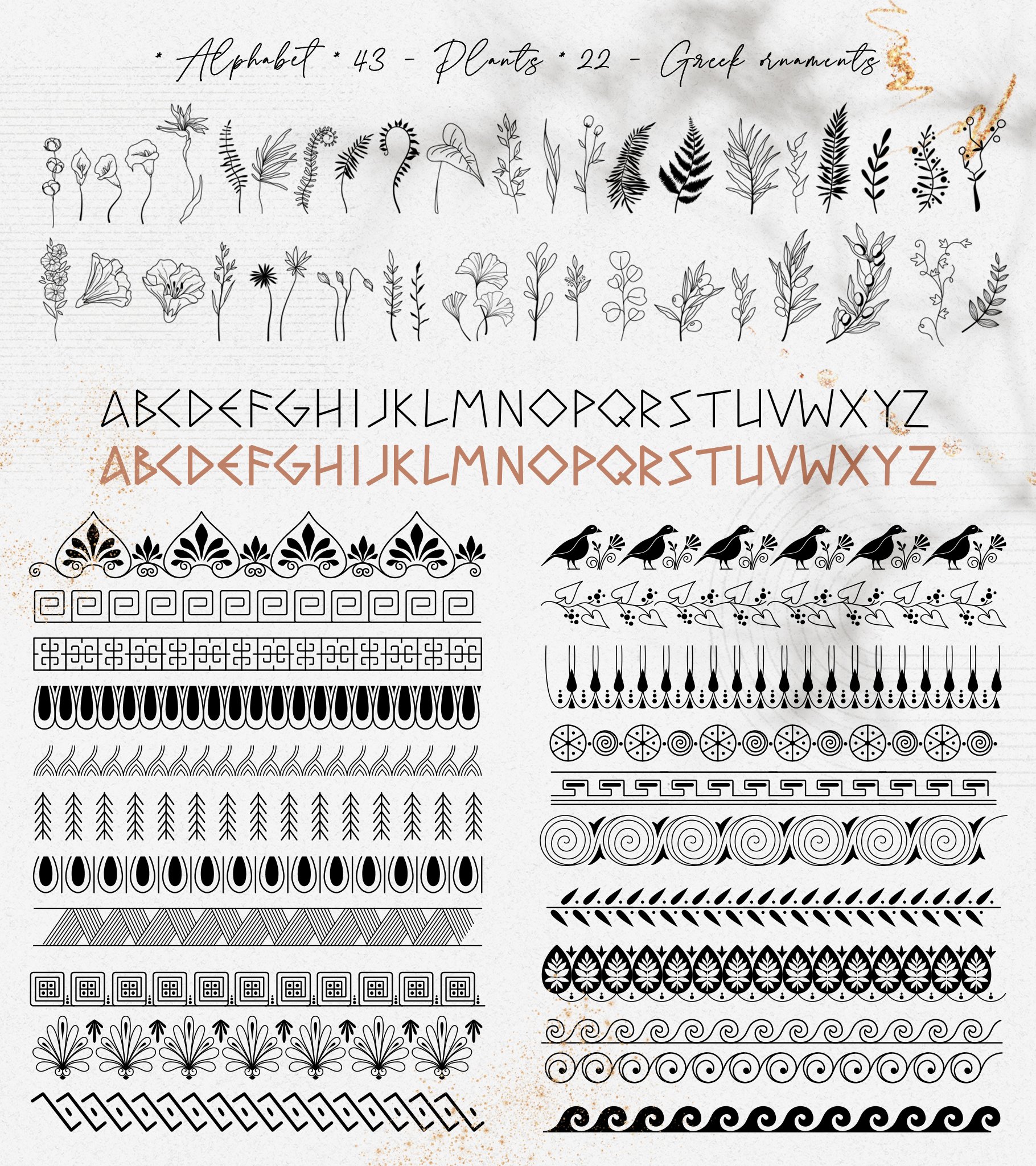 新推出的Antique Greek Beauty 设计套件,这是一套精美的手绘矢量图案素材。该素材包含了228个高清晰度的图案,包括矢量格式(SVG、EPS-10、AI)和位图格式(PNG),提供三种颜色方案:黑线条、纯黑色以及赤陶色。此外,为了增加艺术气息,还加入了一些抽象的自然色彩元素。